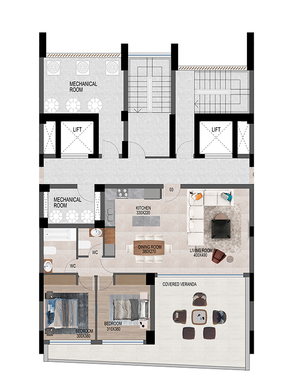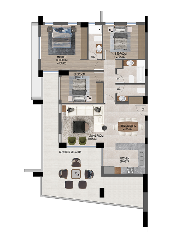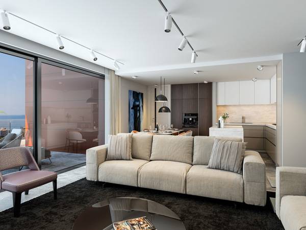 13-ти этажная резиденция включает в себя двух- и трех- спальные апартаменты класса люкс с просторными гостиными и крытыми верандами, позволяя своим резидентам наслаждаться прохладным средиземноморским бризом и солнечными днями круглый год.
