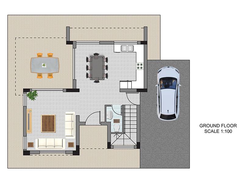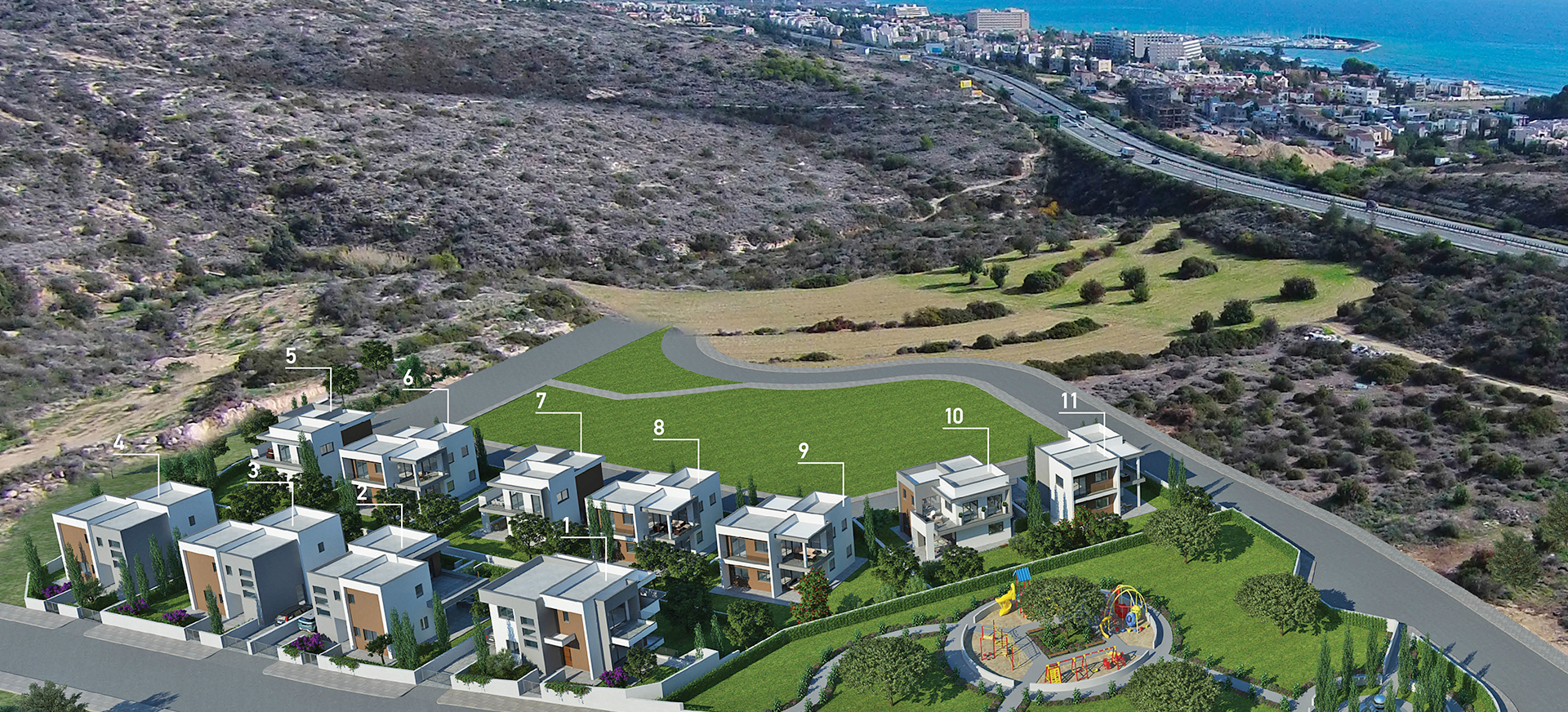 The two and three level houses with full sea views, each host their own private parking and garden, in addition to sharing a green lawn, and a children’s playground for more space and comfort.